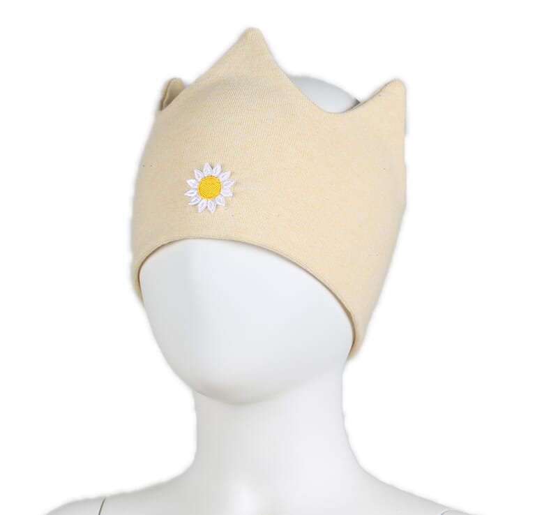 Klassiker fra Kivat. Pannebånd i kronefasong med god passform. Lekker gul med søt sol-applikasjon i front. Vindstoppere ved ørene.