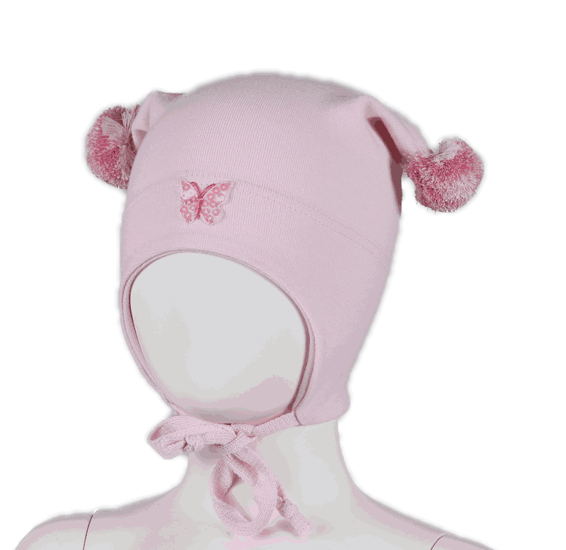 Klassisk fasong fra Kivat. God passform. Snøring under haken. Vindstopper ved ørene. Lekker lys rosa med søt applikasjon av sommerfugl og matchende rosa dusker.