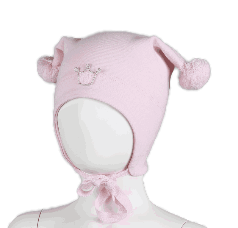 Klassisk fasong fra Kivat. God passform. Snøring under haken. Vindstopper ved ørene. Lekker lys rosa med fin kroneapplikasjon i front og matchende rosa dusker.