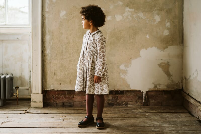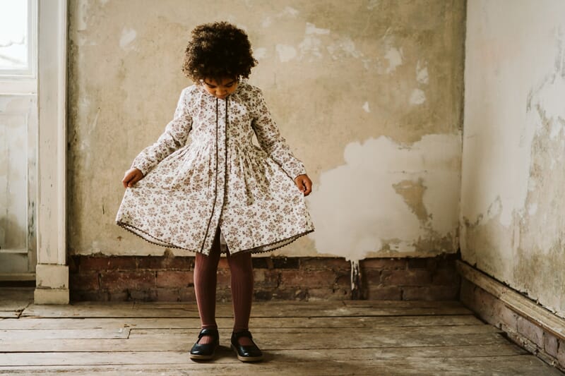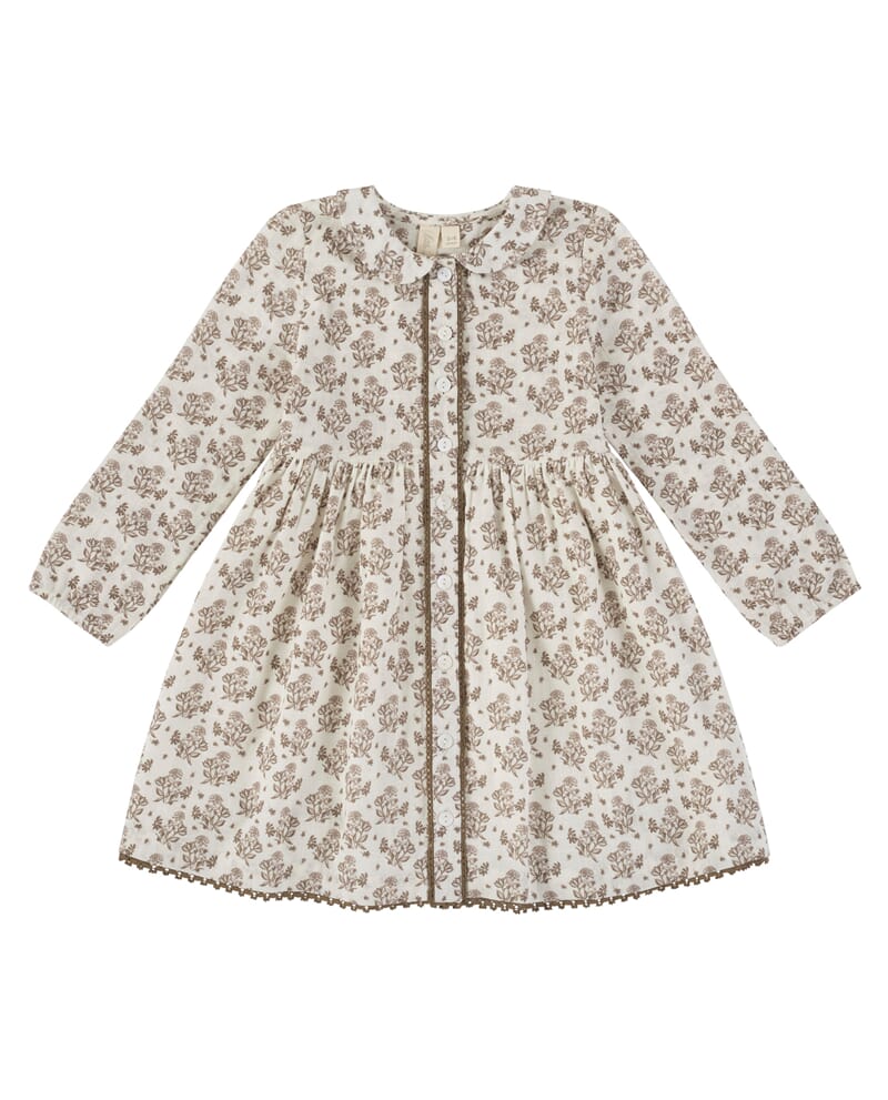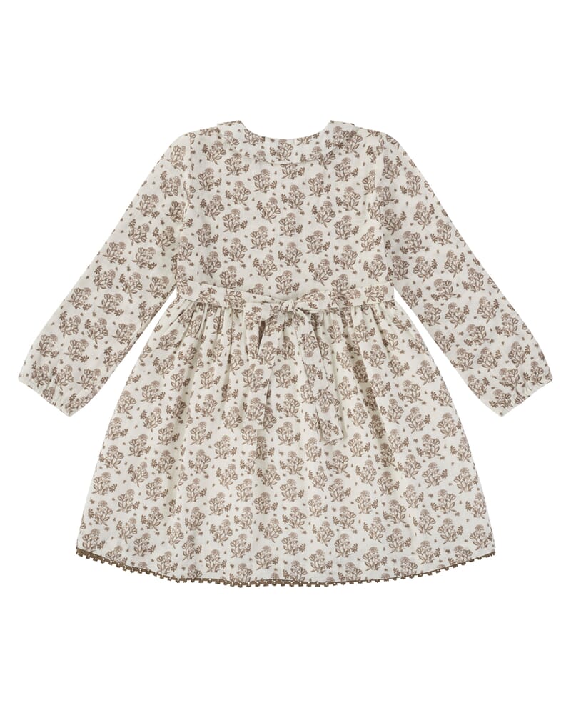 Klassiker fra Little Cotton Clothes. Enkel kjole med nydelig blomstermønster, Peter Pan krage, innsvinget midje, blondekanter langs knappestolpen i front og heklet kant langs skjørtet. Elastikk i ermene. Fôret med et tynt bomullsstoff.