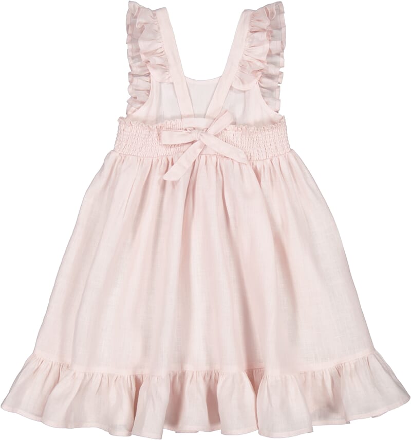 Klassiker fra MarMar Copenhagen. Ermeløs kjole i lin i lekker dus rosa farge. Dekorative rysjedetaljer og lekker knytting i ryggen.