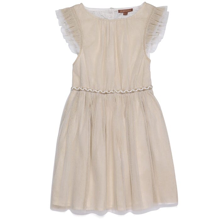 Kremfarget kjole med flettet belte i gull. Enkelt snitt. Myk elastisitet i midjen. Kremfarget med nydelig gullskimmer. Flettet belte i gull. Knapping i midten bak. NB! Noe liten i størrelsen.