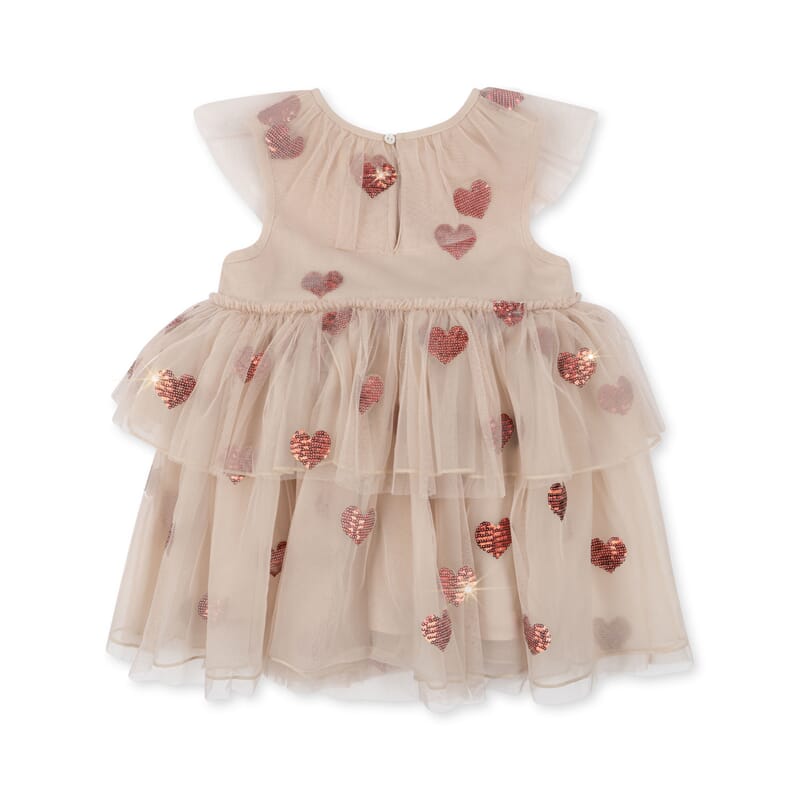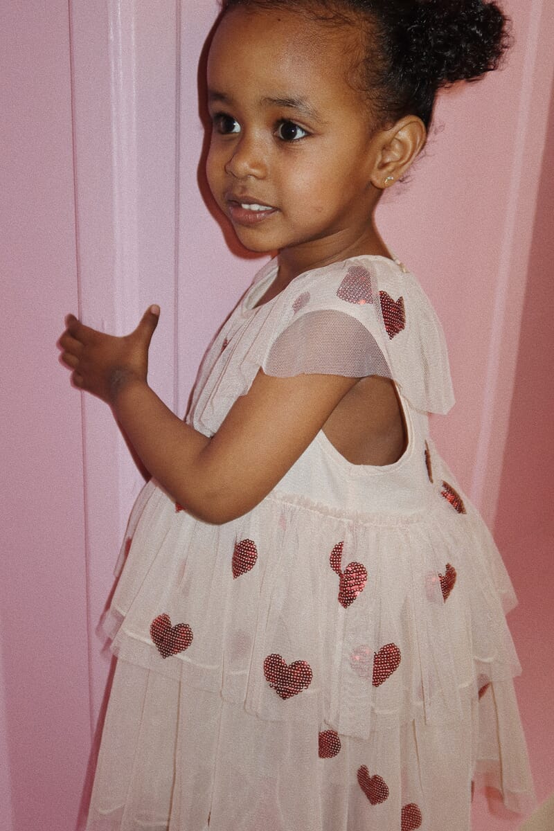 Lekker tyllkjole med glitrende røde hjerter. Fine detaljer og behagelig kvalitet.