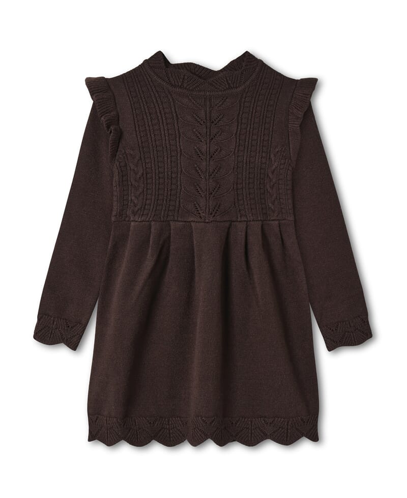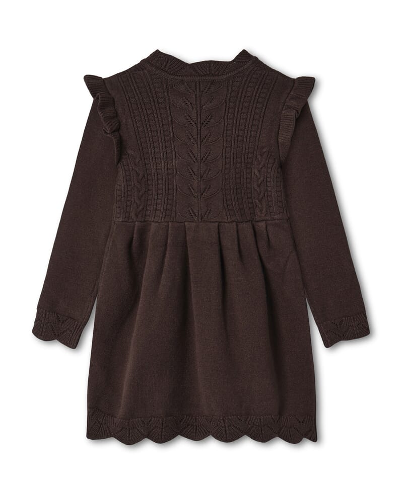 Kjole i mykt og behagelig strikk i viscose-kvalitet. Lekker brunfarge og fine detaljer i front.