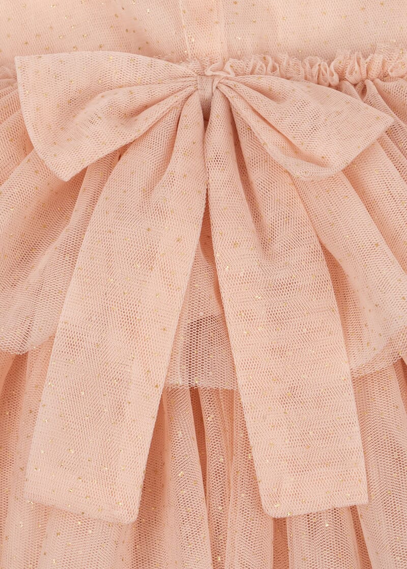 Lekker festkjole med puffermer, diskret skimmer i stoffet og nydelig tyllskjørt i flere lag. Fôret med mykt bomullsmateriale.