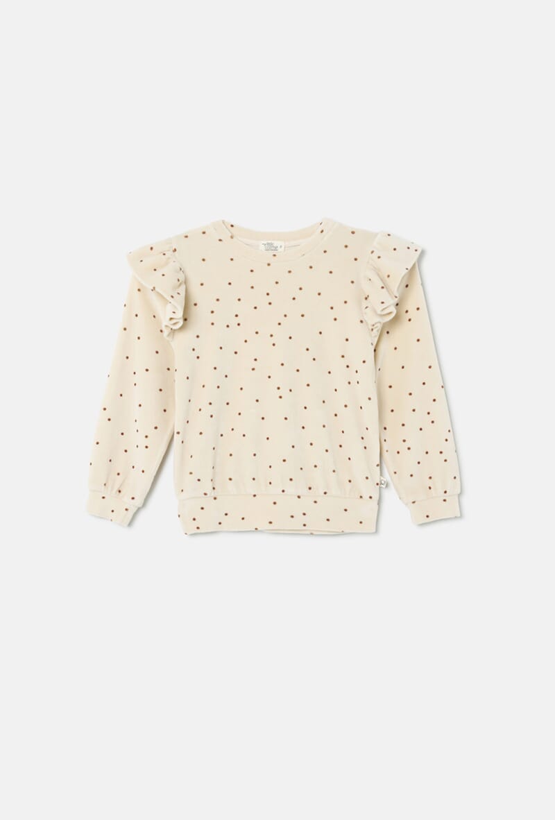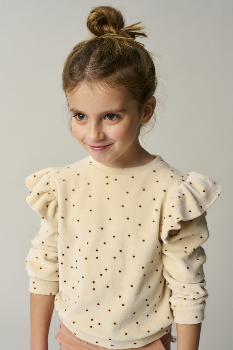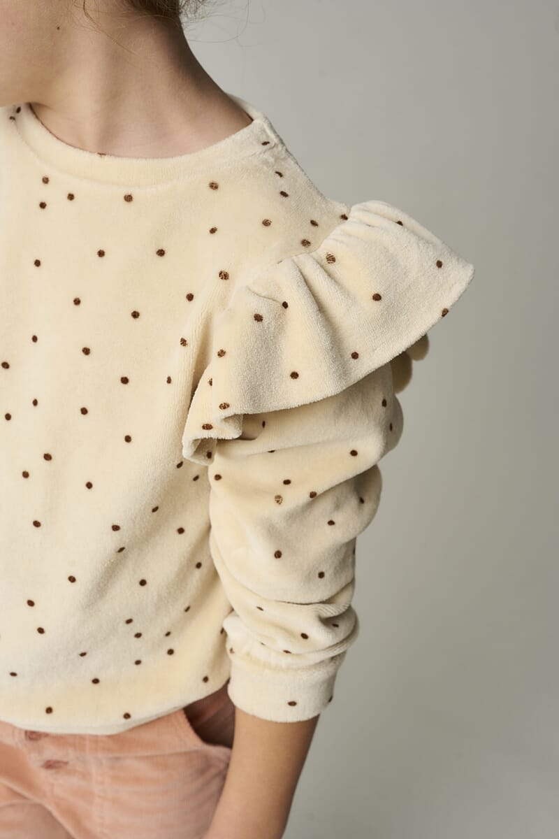 Genser med polka dot mønster og rysjer på skuldrene. Deilig myk og behagelig kvalitet. Knapper i nakken.