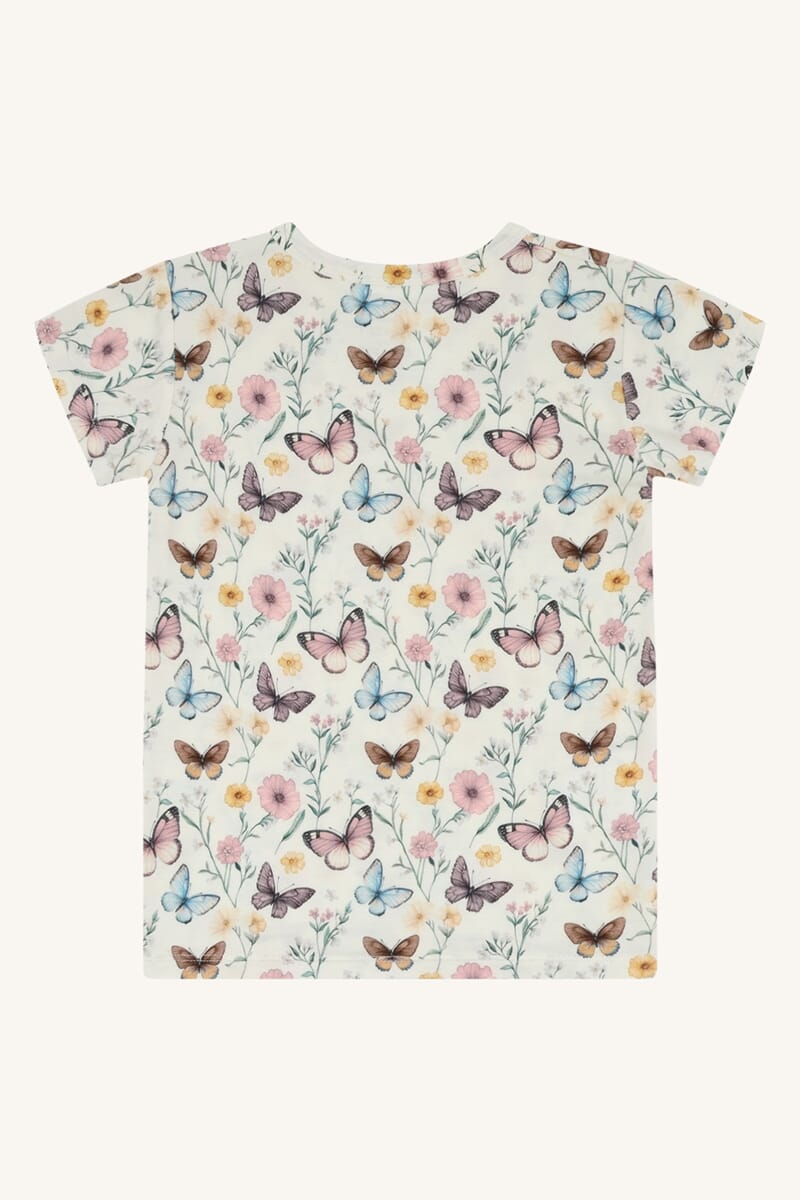 Kortermet genser i svært myk og behagelig kvalitet. God passform. Øko-tex-sertifiserte bambusfibre. Lekkert print av sommerfulger i delikate farger.