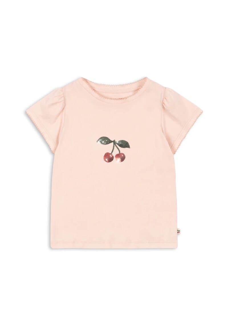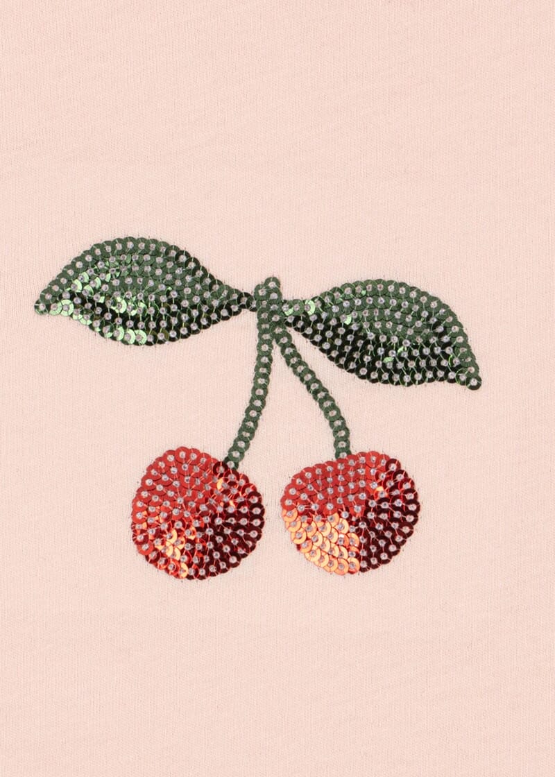 Fin t-skjorte med lekre kirsebær i paljetter. Behagelig og mykt bomullsmateriale.