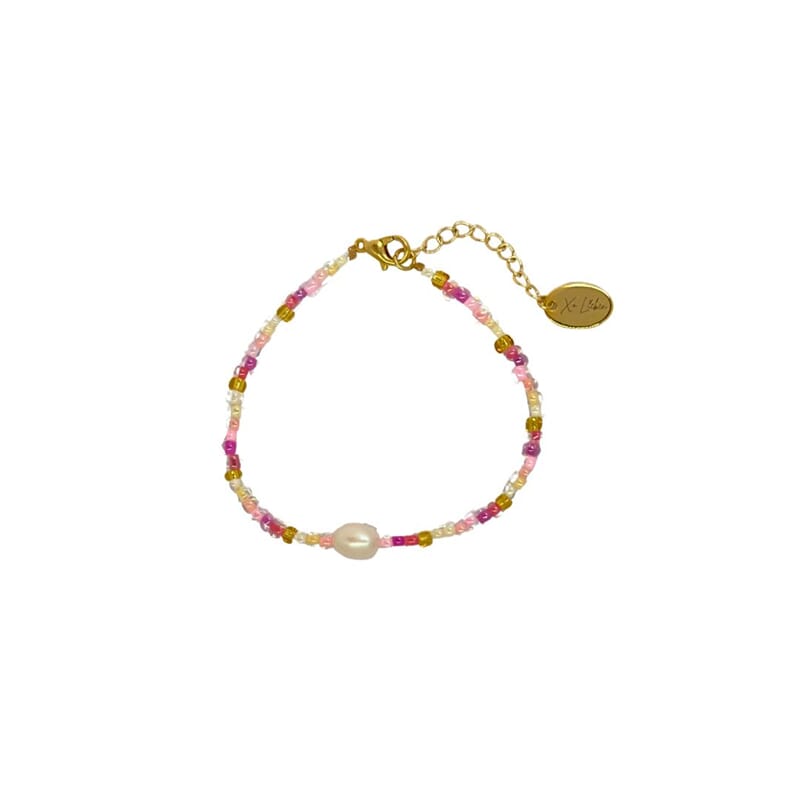 Ella armbåndet består av glassperler i fine rosanyanser, toppet med en ekte ferskvannsperle. Armbåndet kan justeres fra 16-19 cm. Om du ønsker å matche med den lille, finner du også Ella armbåndet til barn.