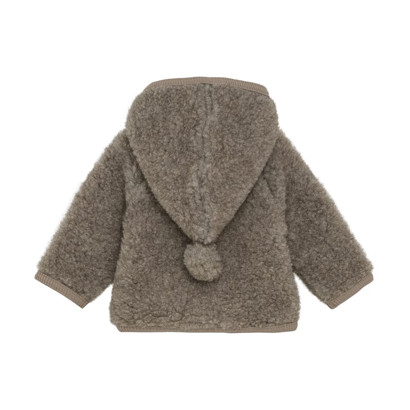 Lekker jakkei deilig teddyfleece-kvalitet i ull. Fine dekorative treknapper, gode lommer og søt spiss hette med pompom.